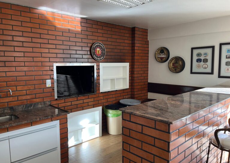 Segundo salão de festas com espaço gourmet moderno;